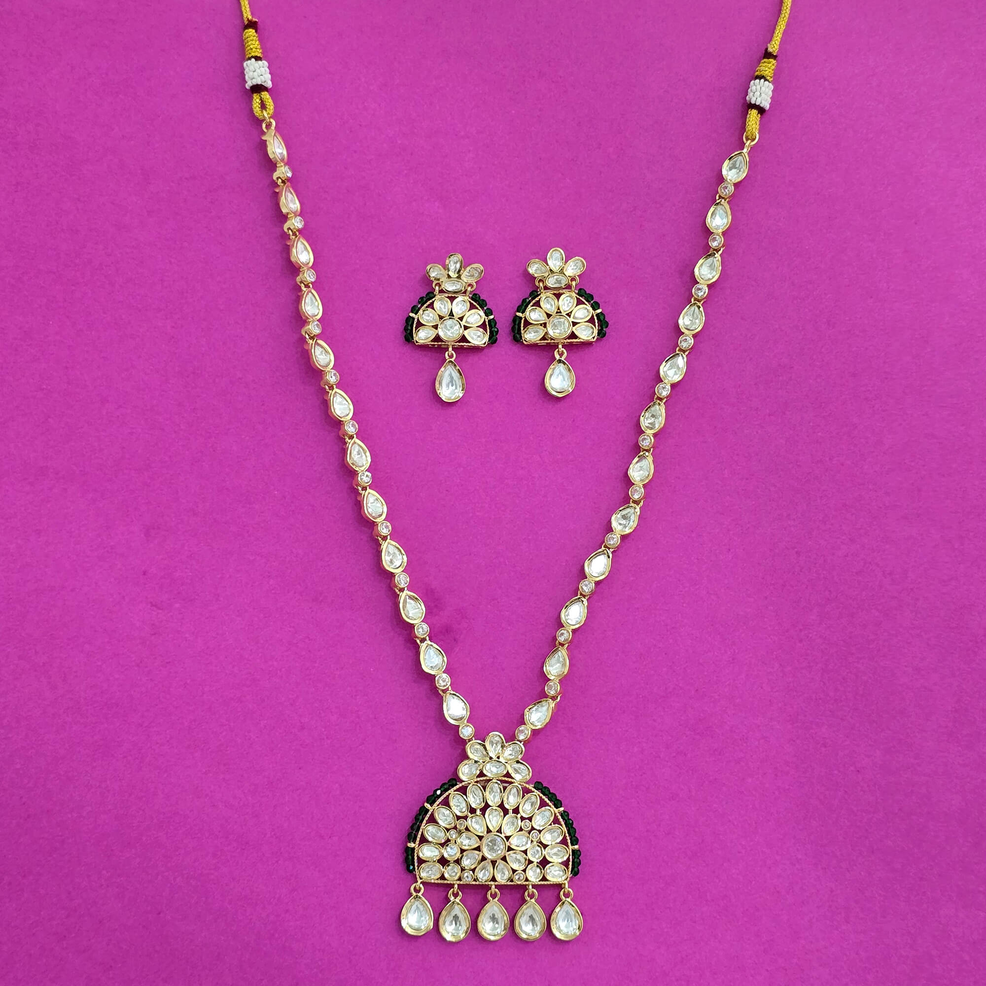 Kanhai Jewels offers an exclusive collection of finest quality crafted Fashion Jewellery in various colors. We make sure that our collection of Kundan Classic Necklace With Gold Plating are beautiful, elegent & will surely galvanize you, because our products are unique, comfortable, fashion forward & very popular for the rich look. Base Metal of our product is Alloy, i.e Mixing of Copper & Brass. We pack all the products using quality packaging material to ensure safe and secure transportation.