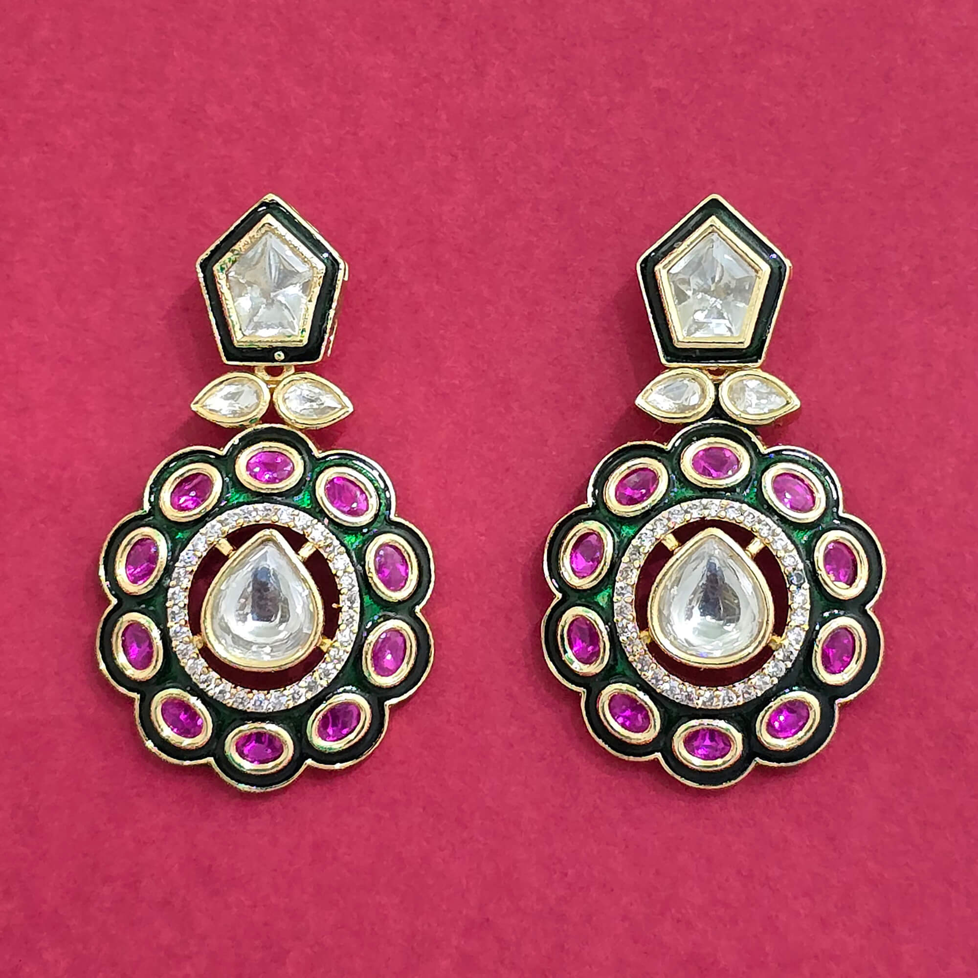 Kanhai Jewels offers an exclusive collection of finest quality crafted Fashion Jewellery in various colors. We make sure that our collection of Kundan Meenakari Earring With Carat Plating are beautiful, elegent & will surely galvanize you, because our products are unique, comfortable, fashion forward & very popular for the rich look. Base Metal of our product is Alloy, i.e Mixing of Copper & Brass. We pack all the products using quality packaging material to ensure safe and secure transportation.