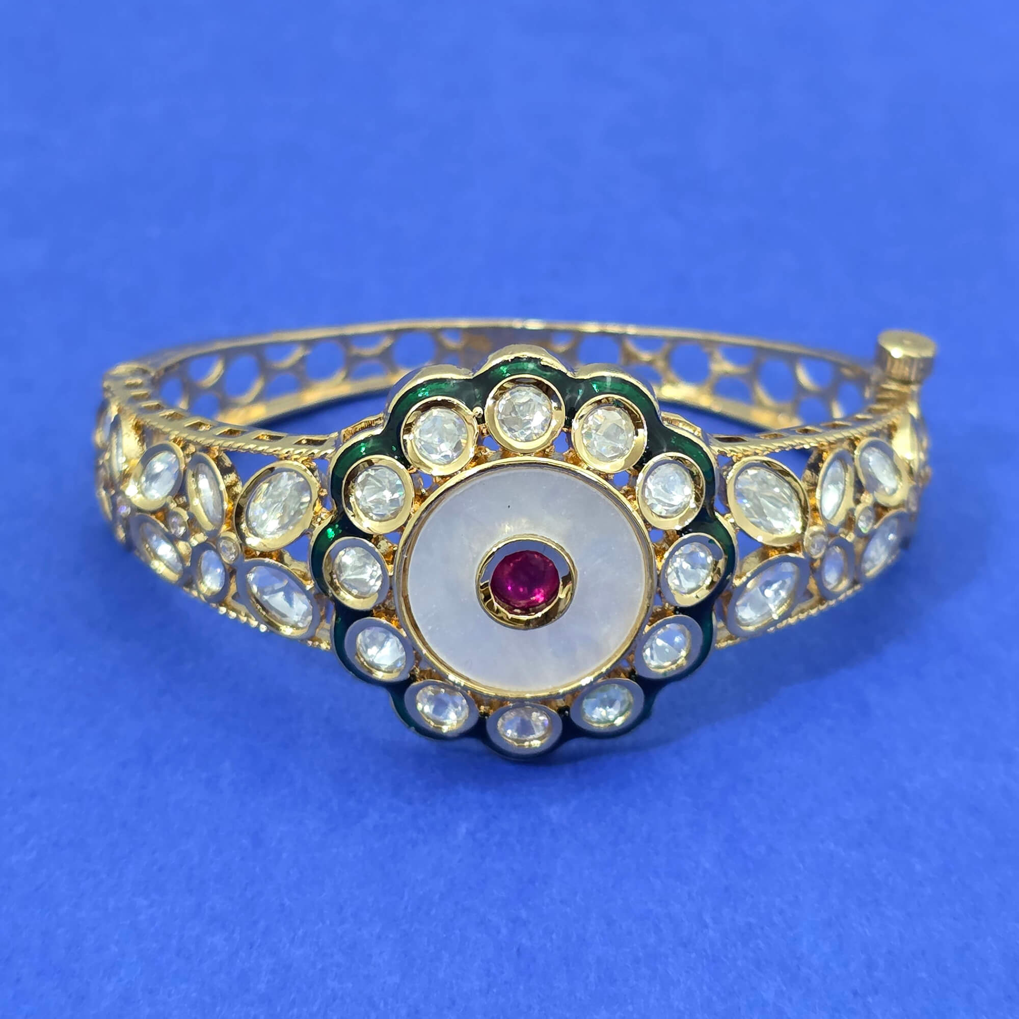 Kanhai Jewels offers an exclusive collection of finest quality crafted Fashion Jewellery in various colors. We make sure that our collection of Kundan Openable Kada With Carat Gold Plating are beautiful, elegent & will surely galvanize you, because our products are unique, comfortable, fashion forward & very popular for the rich look. Base Metal of our product is Alloy, i.e Mixing of Copper & Brass. We pack all the products using quality packaging material to ensure safe and secure transportation.