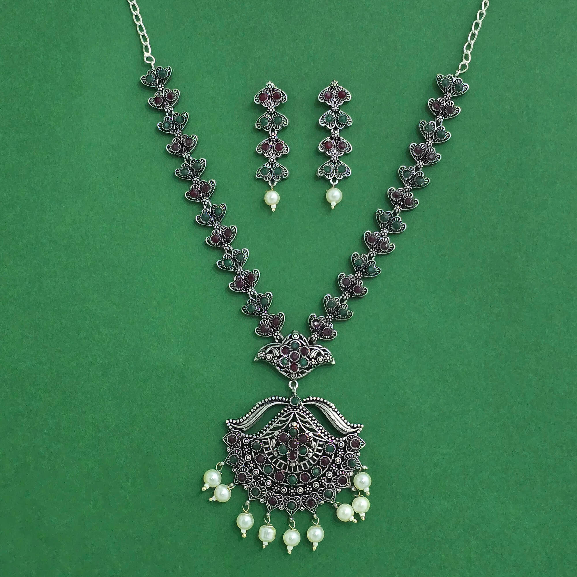 Kanhai Jewels offers an exclusive collection of finest quality crafted Fashion Jewellery in various colors. We make sure that our collection of Moti Necklace Set With Oxidised Plating are beautiful, elegent & will surely galvanize you, because our products are unique, comfortable, fashion forward & very popular for the rich look. Base Metal of our product is Alloy, i.e Mixing of Copper & Brass. We pack all the products using quality packaging material to ensure safe and secure transportation.