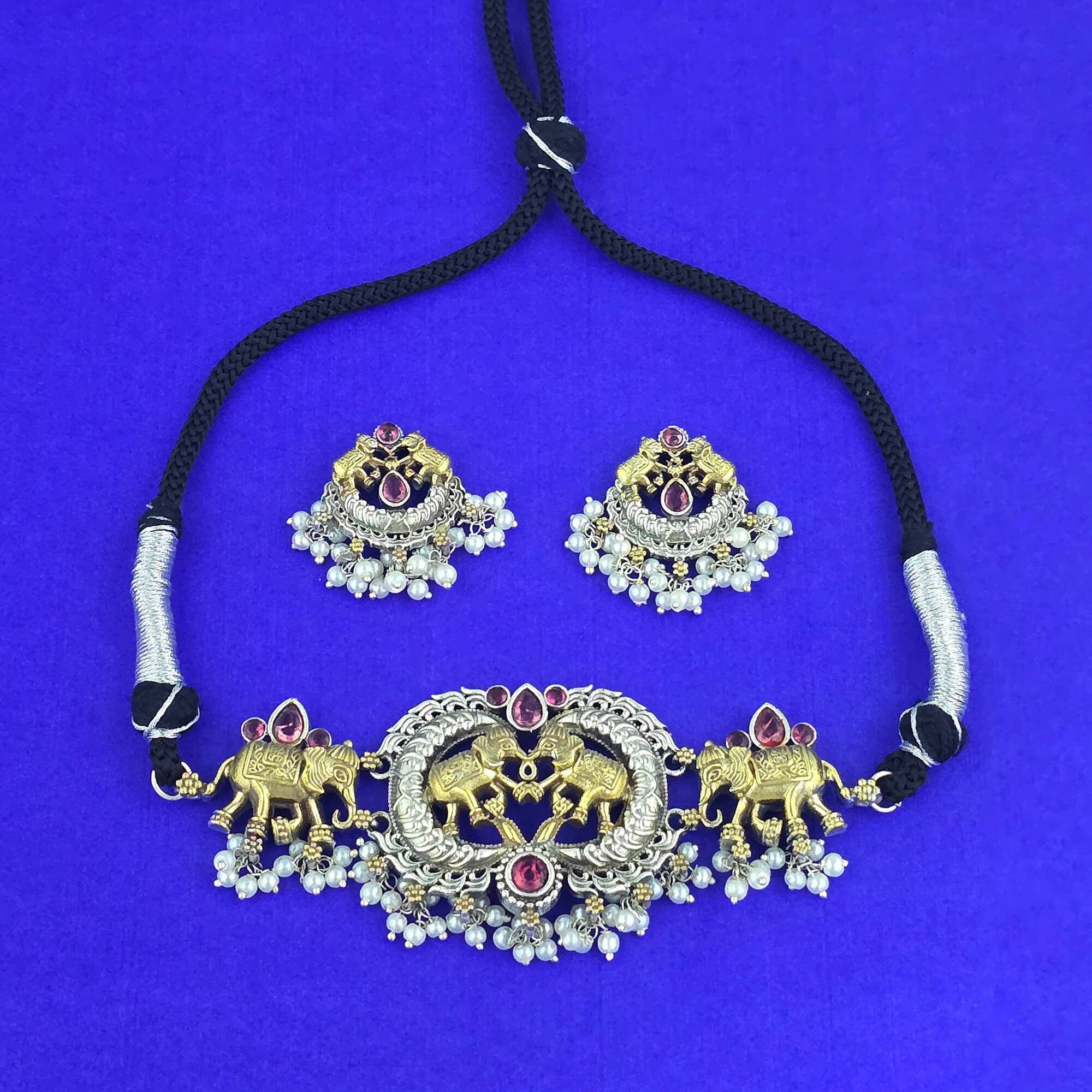 Home / Oxidised Necklace / oxidised choker necklace set with 2 tone plating