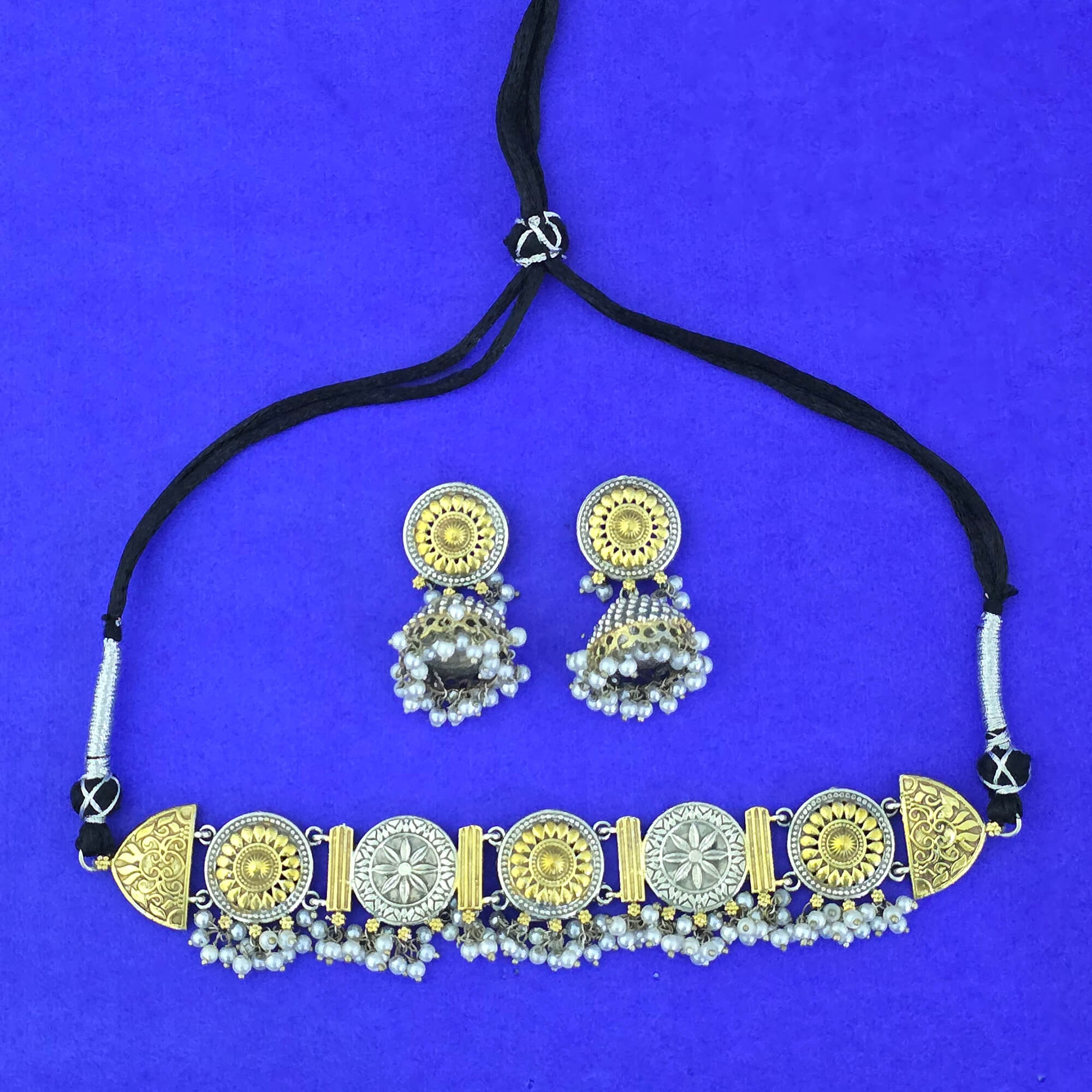 Home / Oxidised Necklace / oxidised moti necklace with 2 tone plating