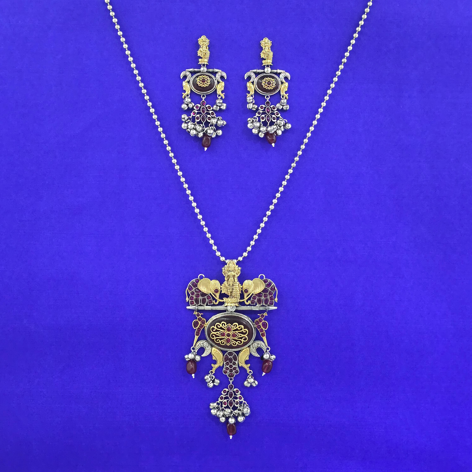 Kanhai Jewels offers an exclusive collection of finest quality crafted Fashion Jewellery in various colors. We make sure that our collection of Oxidised Temple Pendant Set With 2 Tone Plating are beautiful, elegent & will surely galvanize you, because our products are unique, comfortable, fashion forward & very popular for the rich look. Base Metal of our product is Alloy, i.e Mixing of Copper & Brass. We pack all the products using quality packaging material to ensure safe and secure transportation.