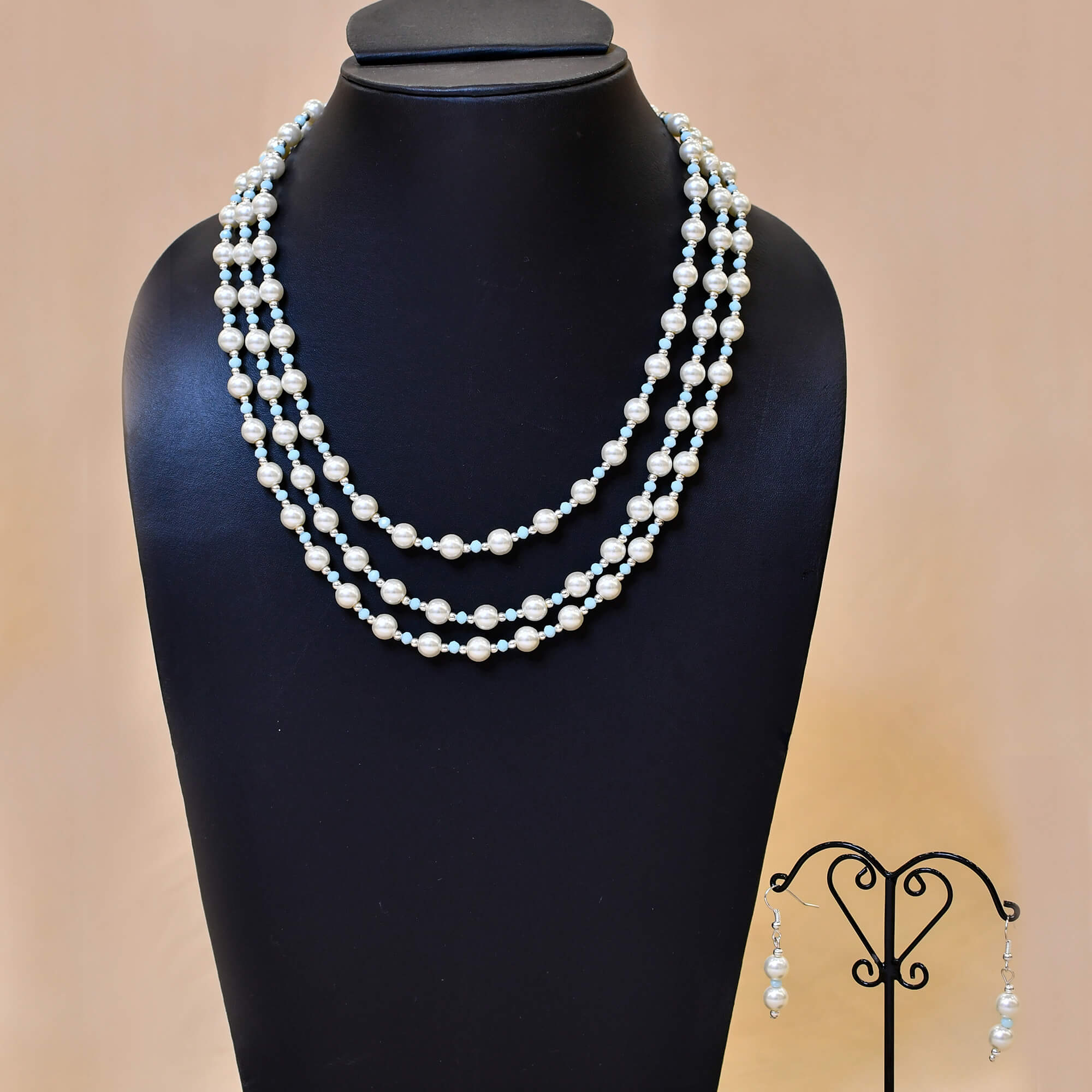 Elevate your look with the "Classic Azure" necklace and earring set, a stunning homage to timeless elegance. This exquisite piece features three perfectly draped strands of lustrous, creamy white faux pearls, meticulously hand-knotted and separated by delicate, tiny aqua or light blue crystal or seed beads. The design creates a luxurious, layered look that perfectly frames the neckline, evoking the glamour of a bygone era. Included are matching dangle earrings with single teardrop pearls, completing this sophisticated ensemble. Perfect for weddings, galas, or adding a touch of vintage chic to any outfit.