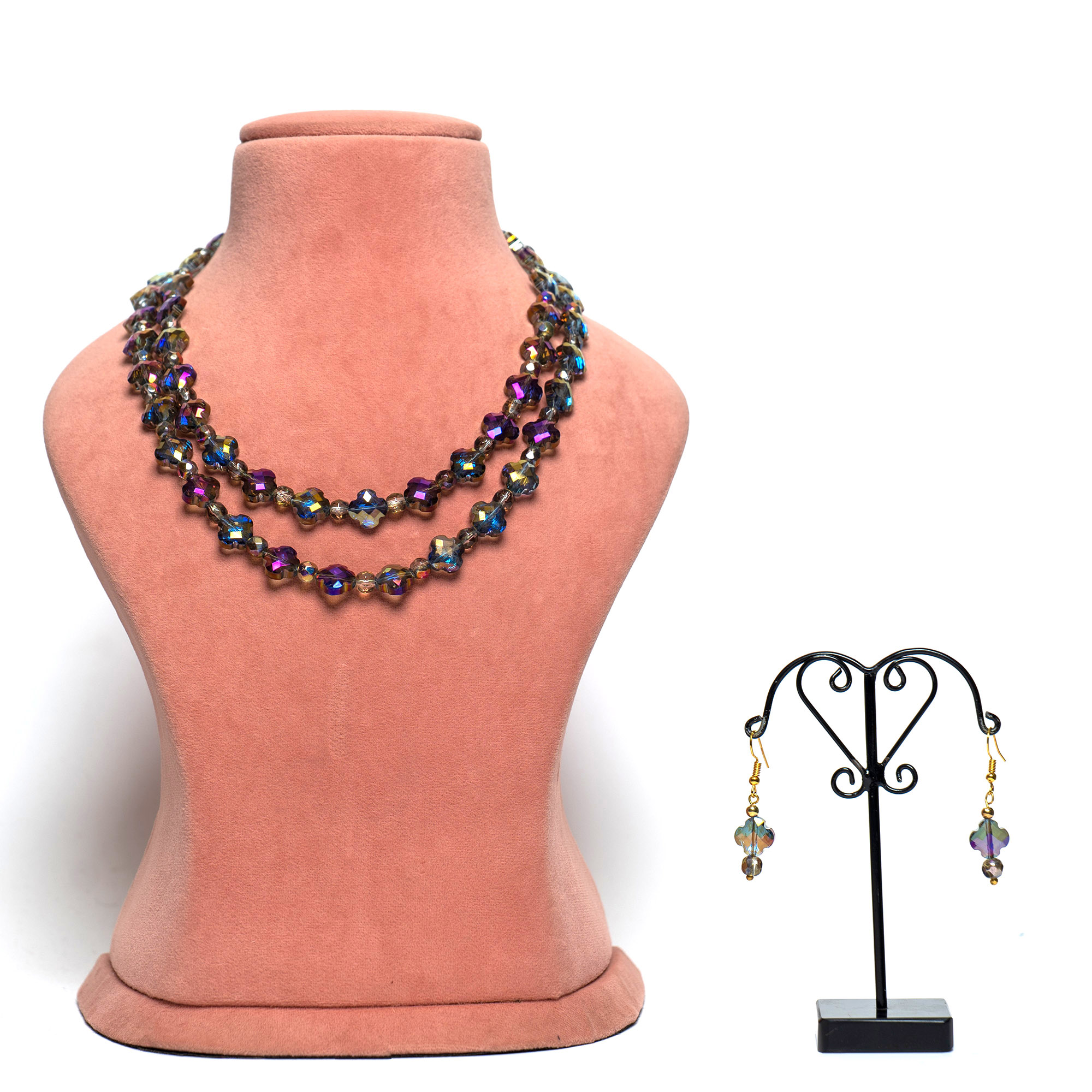 The necklace features two delicate strands of multifaceted iridescent beads that transition from deep, mystical purples to warm, vibrant golds as they catch the light. Paired with coordinating drop earrings, this set is a truly versatile accessory that adds a touch of captivating sparkle to any outfit, from a simple dress to an elegant evening gown