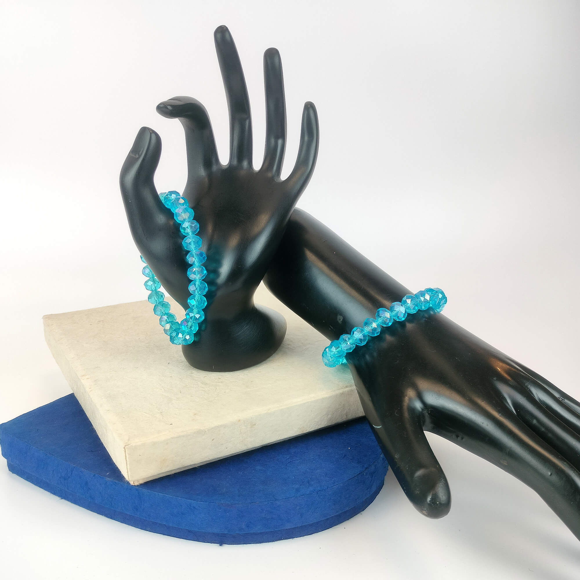 This stunning bracelet features faceted blue crystal beads that shimmer and sparkle in the light. The bracelet is designed to fit most wrist sizes and is perfect for everyday wear or special occasions. The blue crystals are believed to promote calm and tranquility.