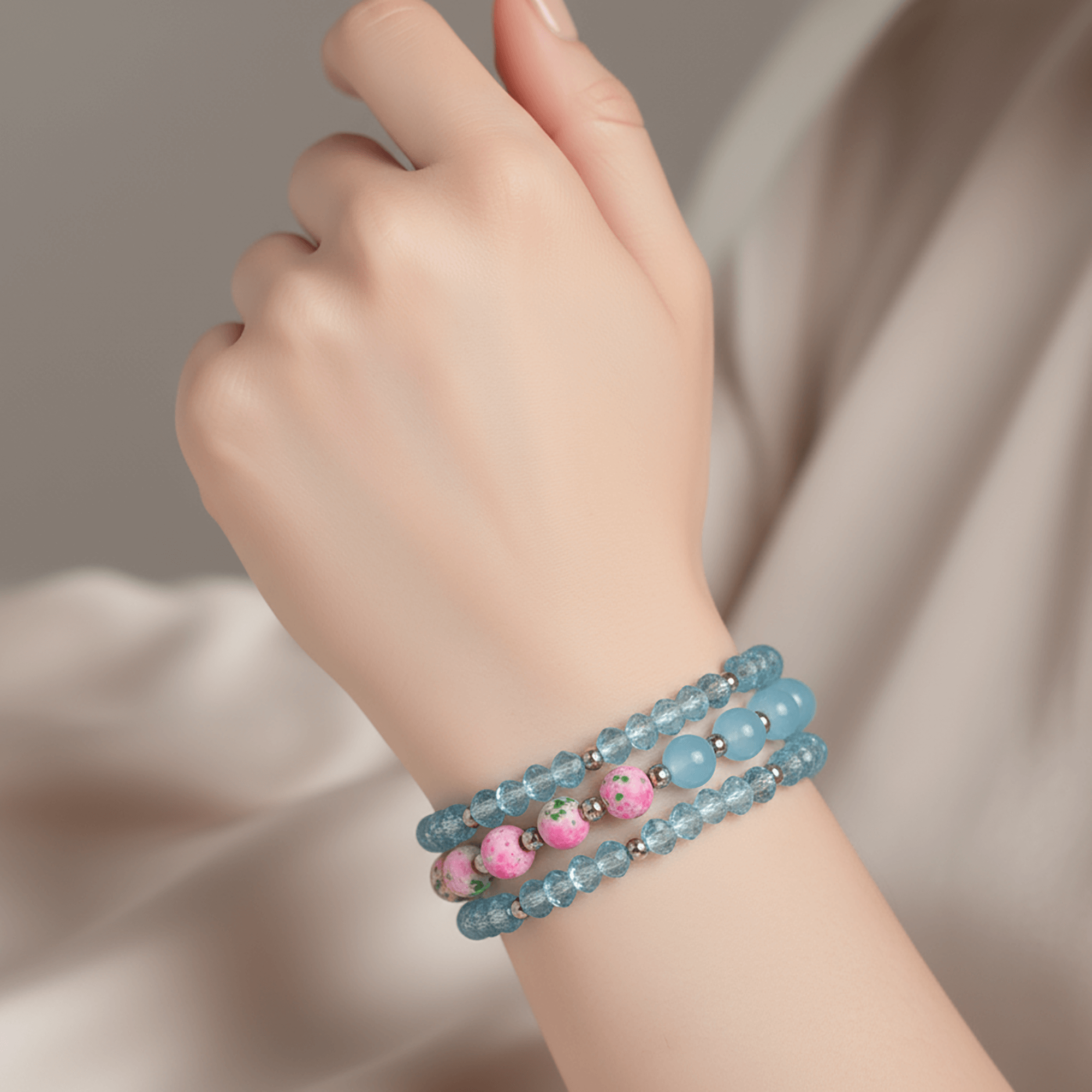 Make a bold, vibrant statement with this unique stackable bracelet set for women. This three-piece collection is a celebration of color and texture, perfect for the Bohemian and contemporary style enthusiast. The set features two strands of dazzling aqua blue faceted glass beads that shine beautifully, paired with a striking center bracelet of smooth, round multi-color splatter print beads